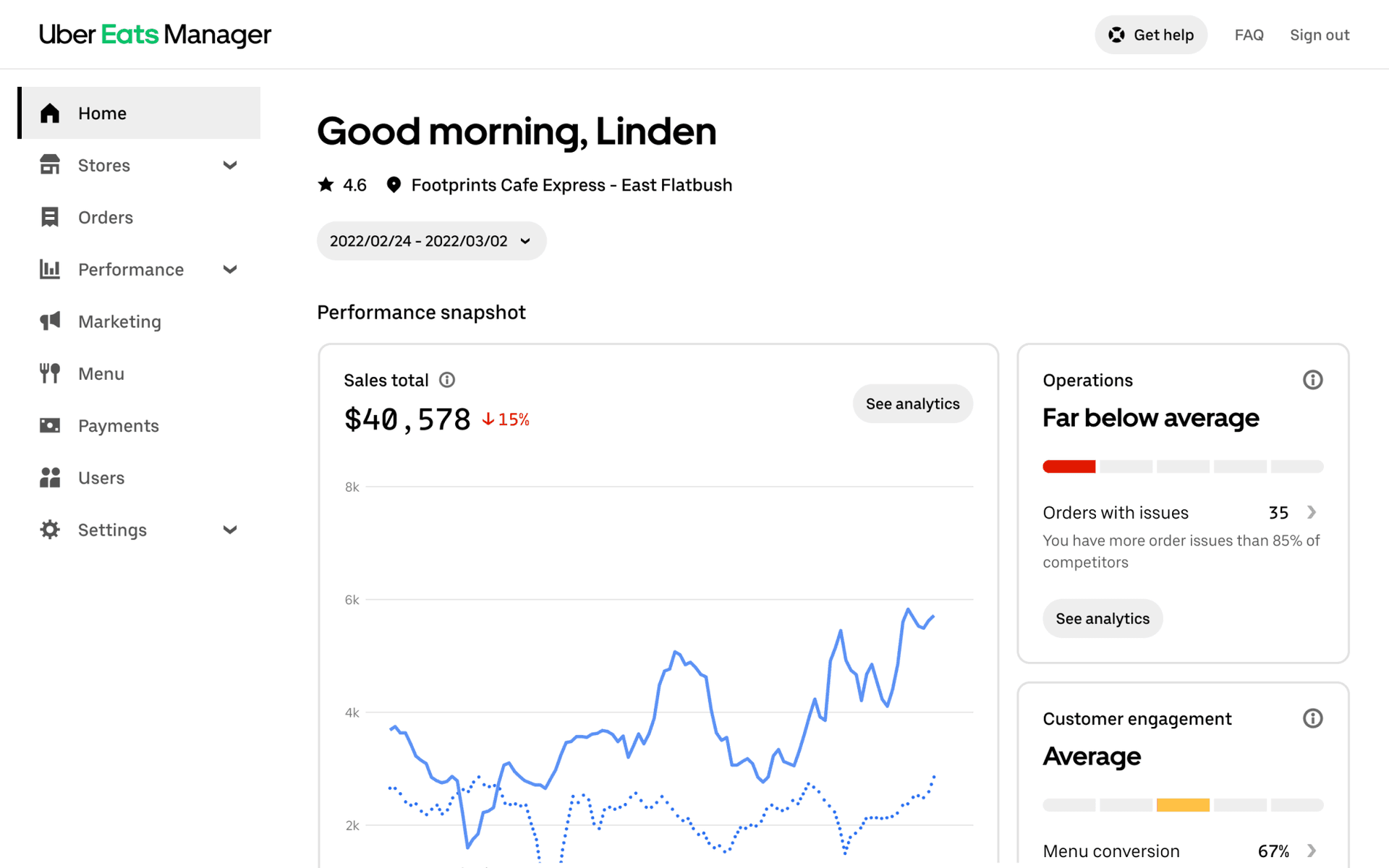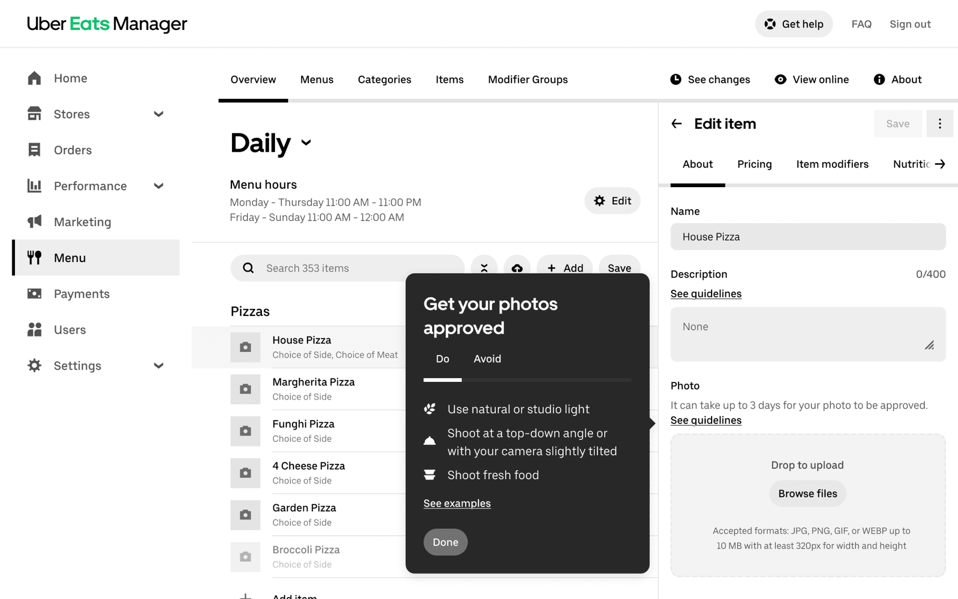 Uber Eats Manager is the web dashboard merchants use to manage their presence on Uber Eats. Over two years, I guided its steady evolution with a talented design team. My role was to advocate for and refine designers' ideas, uphold quality and cohesion, and coach on presentation and decision-making.